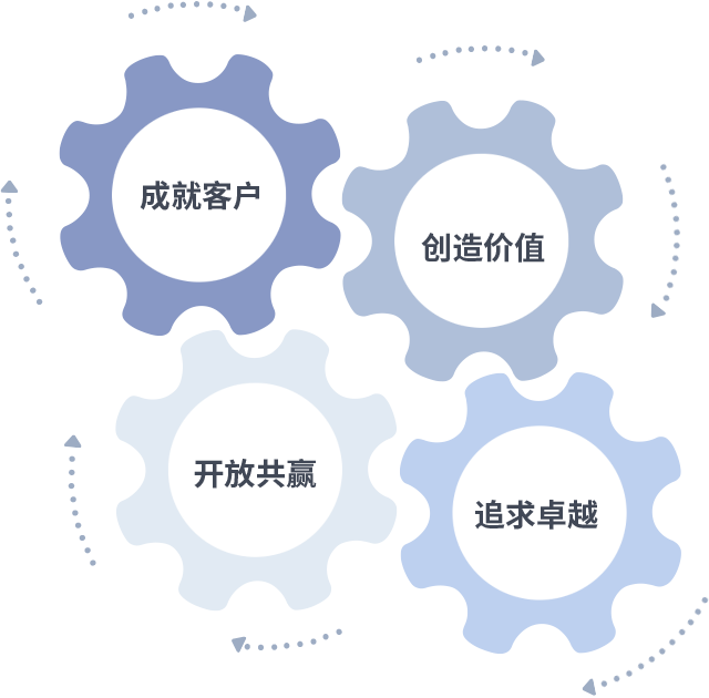成就客户是一切决策的出发点,,创造价值是衡量所有工作的标准,,追求卓越是我们做事做人的态度,,开放共赢是我们的格局也是最终的结果。。价值观的齿轮环环相扣,,,推动着组织里的每个人不断向前。。。。